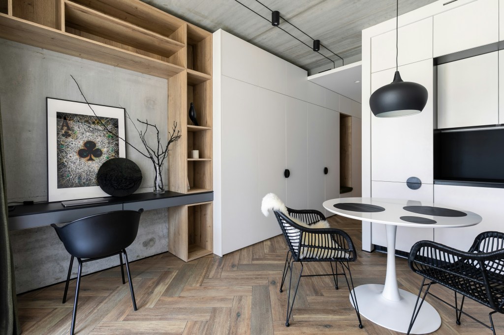 Wyraźne wydzielenie stref (spania, jedzenia, pracy) podnosi komfort życia na małej powierzchni. Wystarczą dywan, regał lub inny wizualny akcent, by stworzyć porządek.